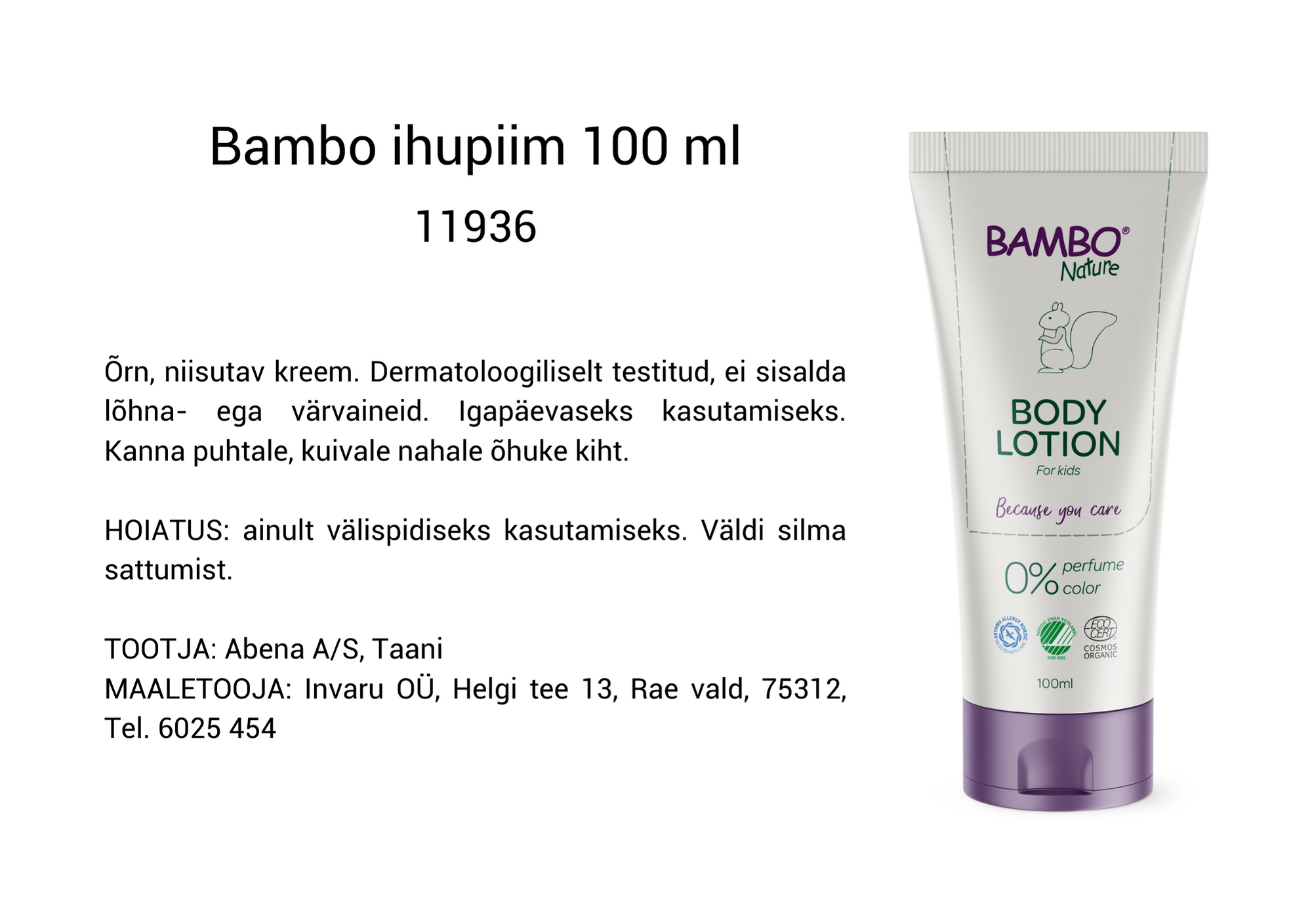 Bambo Nature ihupiim on niisutava ja rahustava toimega ning mõeldud spetsiaalselt imikute ja laste õrnale nahale. Ihupiim sisaldab nahka rahustavat aaloed ja nahka pehmendavaid õlisid, mis aitavad taastada naha loomuliku niiskustasakaalu. Toode on dermatoloogiliselt testitud, ei sisalda lõhna- ega värvaineid ning on keskkonnasõbralikult toodetud. Bambo Nature ihupiim sobib ka veganitele, sest ei sisalda loomseid koostisosi. Bambo Nature ihupiim vastab Ecocert Cosmos, Nordic Swan ja Asthma Allergy Nordic sertifikaatidele. Kasutamine: kanna nahale väike kogus kreemi pärast pesemist või vastavalt vajadusele. Väldi ihupiima sattumist silma.