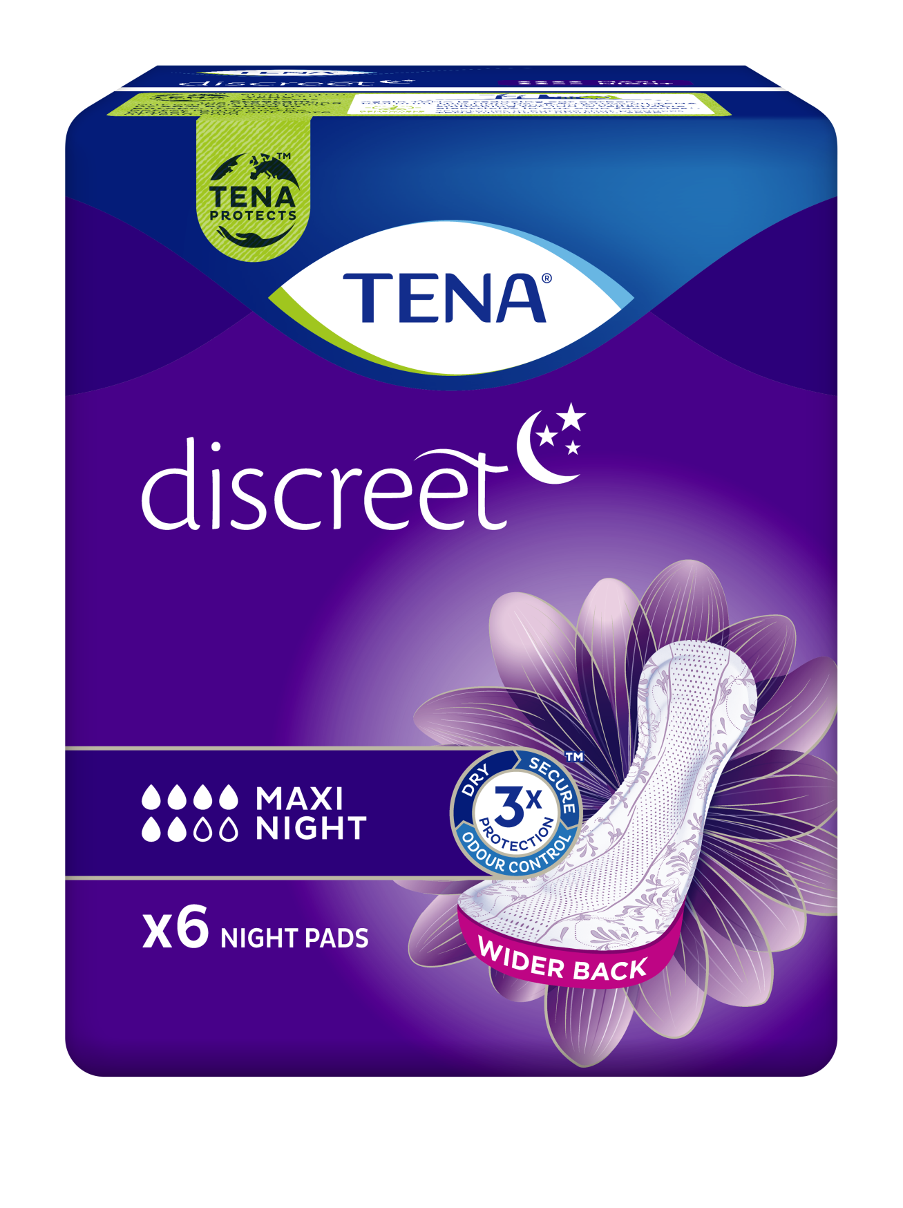 Uriinipidamatuse side TENA Discreet Maxi Night pakub naistele kindlat kaitset. Lisapikkus ja laiem tagaosa kaitsevad optimaalselt lekete eest pikali olles ja teevad toote sobivaks kasutajatele, kellel esineb mõõdukas kuni raske põiepidamatus eriti just öösel. Maksimaalne imavus seal, kus see on kõige vajalikum – niiskus juhitakse kiiresti nahalt eemale, et tunneksite end kuivalt. Ainulaadsed mikropärlid vähendavad soovimatut lõhna. Põiepidamatuse sideme pehmed ja elastsed küljed kohanduvad keha kumerustega. See on väga mugav ning kaitseb lekete ja ebameeldiva lõhna eest, et tunneksite end kindlalt ja saaksite hästi magada.